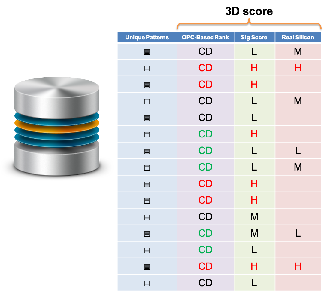 Patterns in the Design Decomposition Database are scored on the basis of any and all available information sources. These include simulation sources such as OPC simulation, statistical or geometrical sources (design signatures), and empirical sources such as pattern fidelity information extracted from real-silicon SEM images.