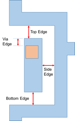 The process of defining constraints begins with identifying the key geometric properties. In this case we want to ensure that the metal island is flanked on three sides, that it contains a via, and that the via is located within a specified distance from the line end.